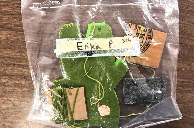 I prepare small felt swatches with five pins and a needle on each swatch. I prep embroidery floss by wrapping it around a small piece of cardboard that has a slit on each side to hold the ends of the thread. Each student receives a gallon-sized ziplock which they write their name on and store everything in until they complete their project.