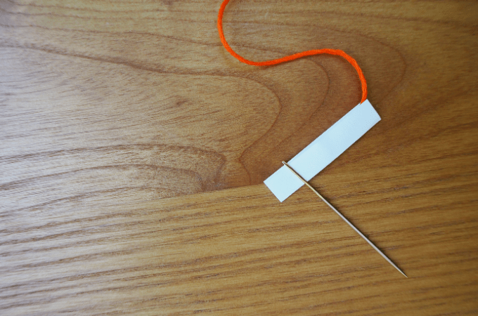 Now if you ever had a class of kids all needing help threading their needles at the very same time and you don’t have any needle threaders around you’re going to LOVE this one. A piece of paper about an inch long and half an inch wide folded length ways in half is your life saving needle threader!