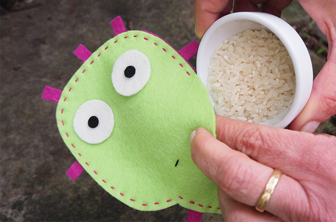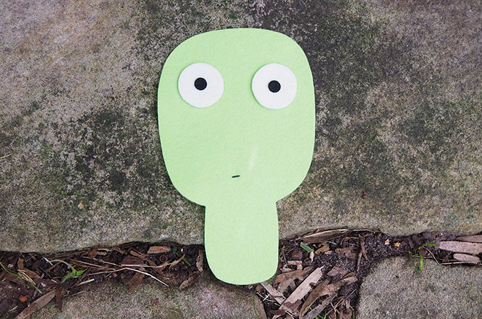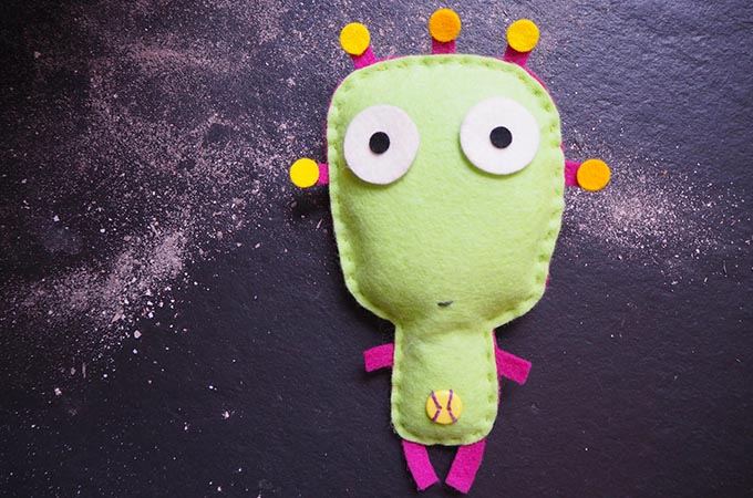 Position the eyes and glue into place. I’ve used a single black stitch to make Little Alien’s mouth.