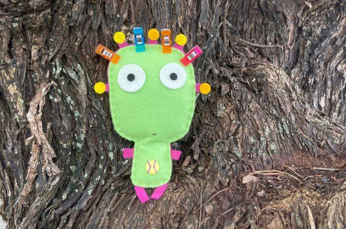 Trace template for front of Little Alien’s body onto green felt and cut out. Trace template for the back of his body onto pink felt and cut out. Trace circle template for eyes onto white felt and cut out two eye circles. Cut or punch out the eye pupils from black felt. Punching is an easy way to make small circles. I used a hollow punch. This video on cutting out circles from felt shows you how. Cut or punch out the antenna endings from yellow felt.