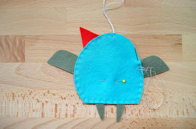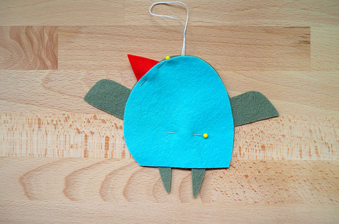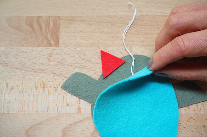 Position the beak between the front and back layers of Inga. Fold the embroidery floss in half, knot to make a loop and place in position at the top of Inga’s head as shown above. I’ve used Aurifloss to make my loop.