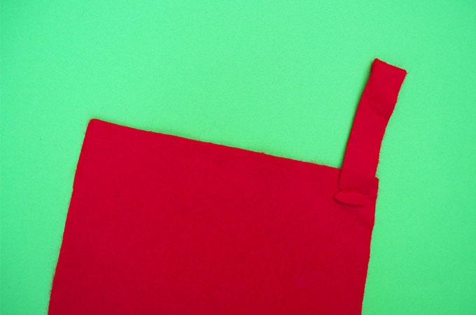 Cut a 10 cm x 1 cm strip of felt to make a loop for the stocking to hang from. Pin and sew the loop into place the loop into place.