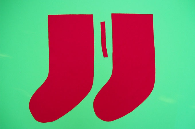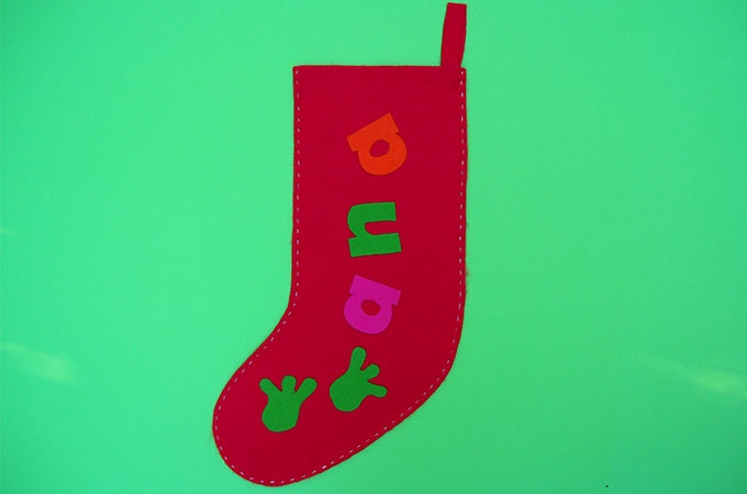 1. Print out the stocking template. Cut out the two halves and tape them together to complete the stocking’s shape. Pin this template onto each of the 45 cm X 30 cm pieces of felt and cut out two stocking shapes.