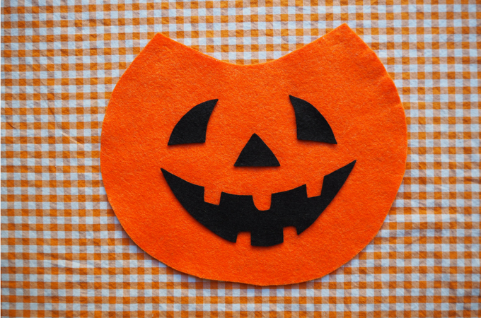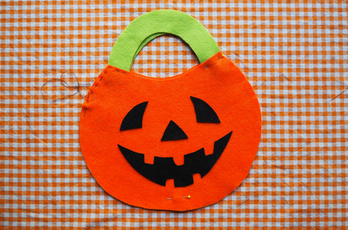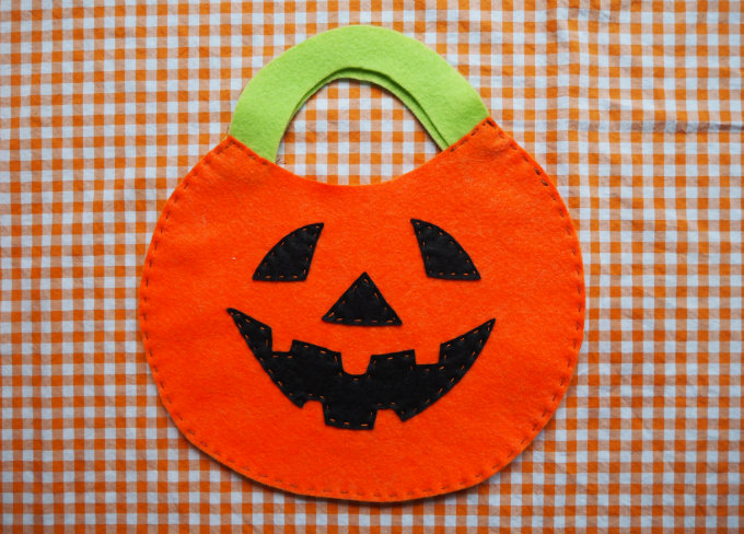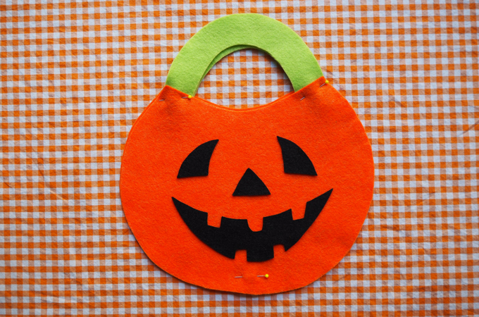 Download and cut out the Great Pumpkin trick or treat bag templates. Tape the two sides of the pumpkin template together and use it to cut out two pumpkin shapes from orange felt. Use the handle template to cut out two handle shapes from green felt. Use the black felt to make the eyes, nose and mouth.