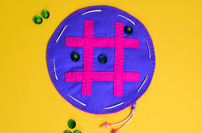 Take the purple circle and position the four strips of pink felt on it as shown below. Pin and sew or glue into place. This game board will be on the inside of your pouch.