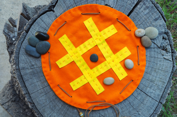 Finally, make a set of playing pieces. You can use pebbles and shells, beans and erasers…anything really…just remember that the playing pieces do have to be visibly different so that the two players can identify their pieces from their opponents. In the top photo you can see that I’ve used glass pebbles as playing pieces. To distinguish them I’ve painted flowers on some and left others plain.