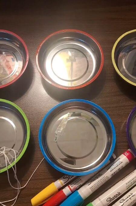To hold and distribute my students’ needle and needle threader, I got some magnetic dishes from a hardware storage and colored the rims with the students’ table colors.