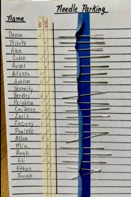 I prepare small, clear plastic, numbered containers for my students. Inside each container is a magnet that holds their needle and six sewing pins. Each student has to use the same numbered box for each lesson. To keep track of everything, I have a folder with the class list and the numbered container assigned to each student.
