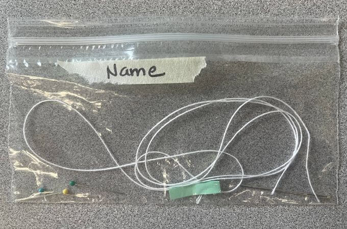I prepare small felt swatches with five pins and a needle on each swatch. I prep embroidery floss by wrapping it around a small piece of cardboard that has a slit on each side to hold the ends of the thread. Each student receives a gallon-sized ziplock which they write their name on and store everything in until they complete their project.