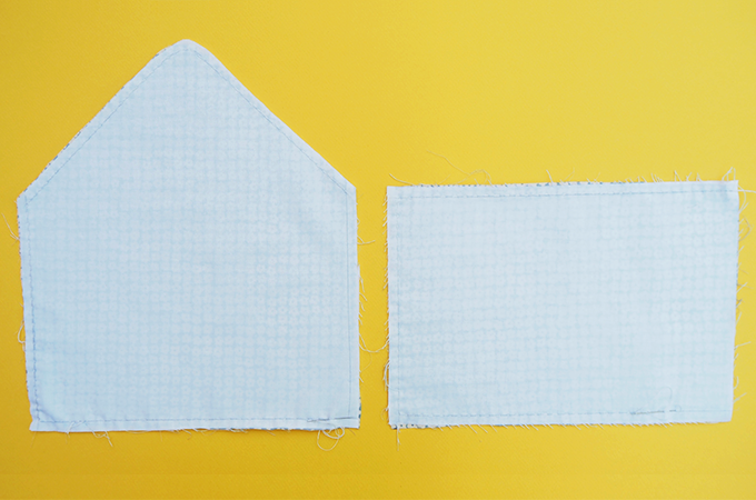 Place the two envelope shapes right side together. Pin and sew them together leaving one side open. Do the same for the two 10″ x 7′ rectangles.