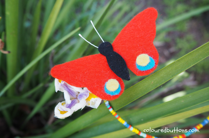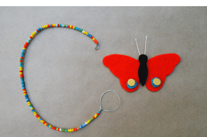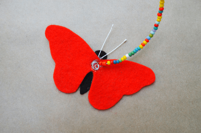 This DIY felt butterfly mobile was one of the crafts I designed many years ago. It was the time before Sew a Softie and before I started to focus my attention on just teaching hand sewing to kids. I used to run after school craft classes and birthday parties and I found beading onto wire was a great activity for older kids as well as the little who wanted to join in with their older brothers and sisters. So I designed lots of different crafts using beads and wire…and the kids loved them. This felt butterfly mobile is perfect for those of you with spring fast approaching…actually it’s perfect for every season.
