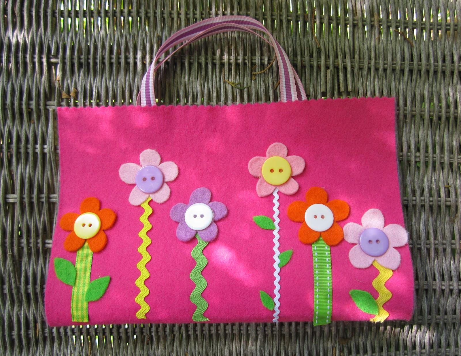 3. Take the other 11″ x 8 1/2″ piece of felt and sew or glue your design into place. I’ve designed my game to be carried or hung like a bag so I’ve placed my row of flowers on one half of the felt only.