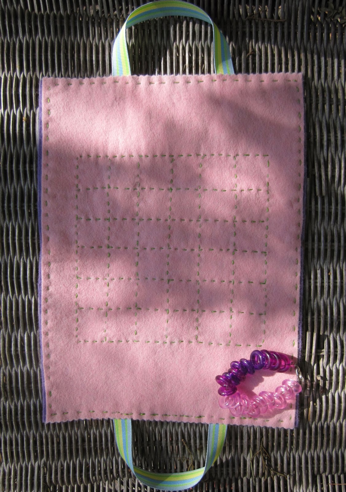 2. Sew or glue a 6″ x 6″ grid onto your felt. In the first version below, I’ve ironed vlisofix onto the back of a piece of dark pink felt, cut out fourteen 6″ x 1/4″ strips and then ironed these onto my felt in the shape of a grid. In the second version, I’ve sewn the grid on with a running stitch.