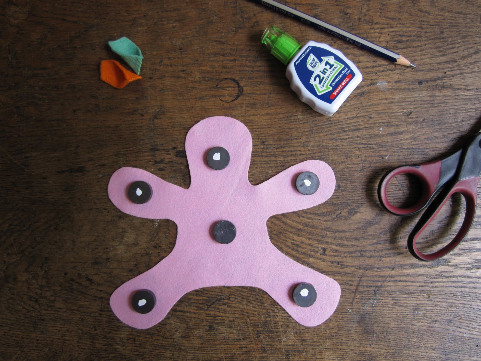 4) Take your magnets and glue them to the arms, legs and head with the dot facing upwards and to the tummy with the dot facing downwards as shown in the photo below: