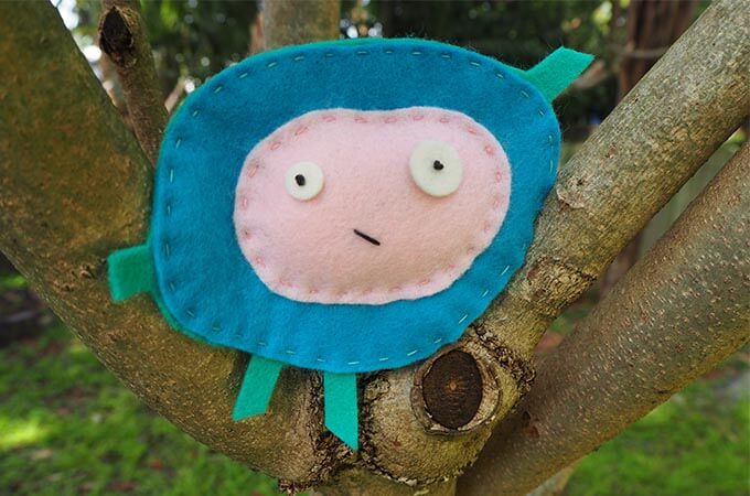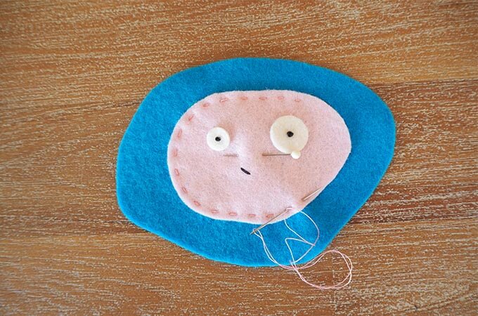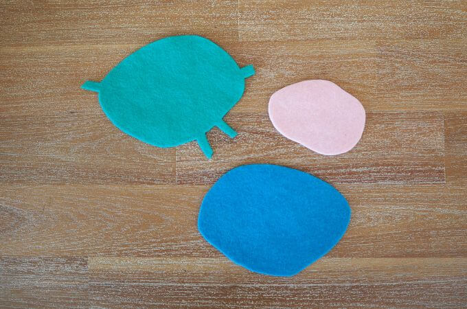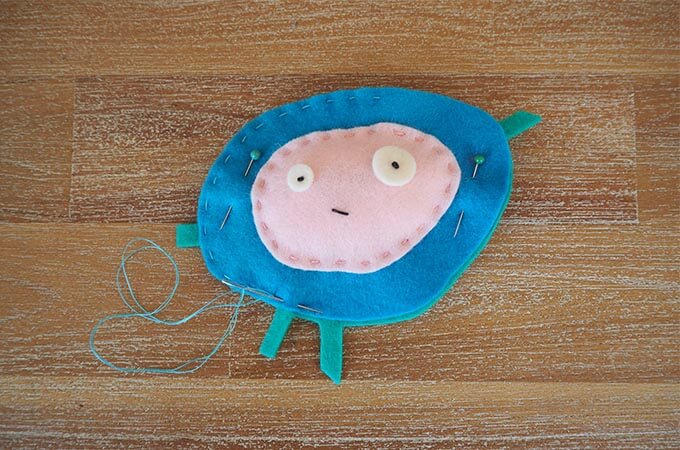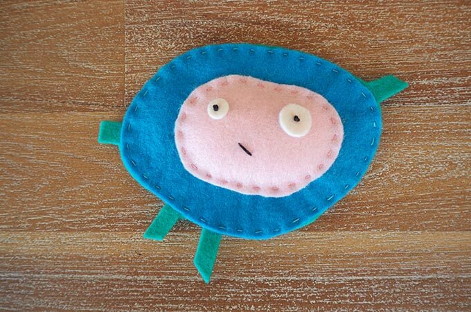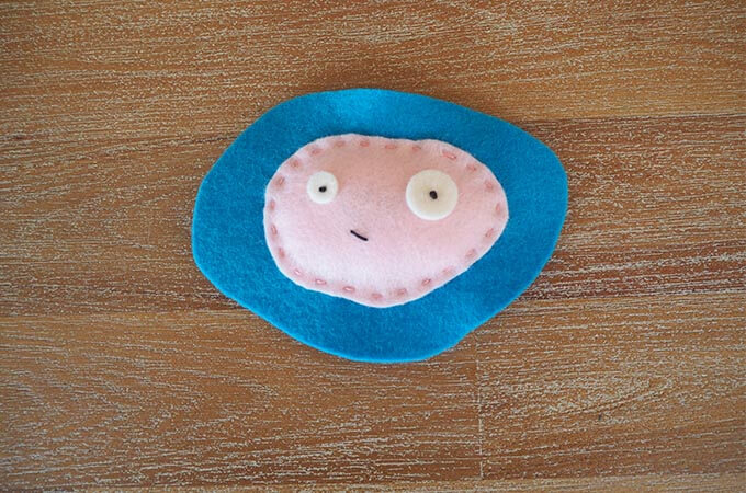 Download the templates. Trace and cut out Dot Day Zenki’s face from pink felt, the front of his body from blue felt and the back of his body from aqua felt.