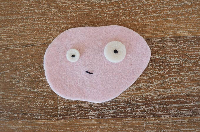 Position the eyes on the face and sew into place with a french knot. This creates the pupils. If you don’t know how to sew a french knot you can learn how easy it is from my video or just glue on eyes and pupils.