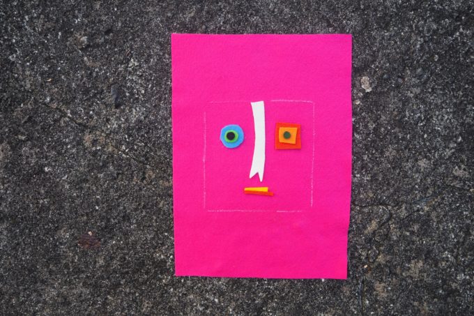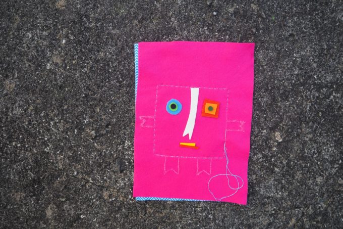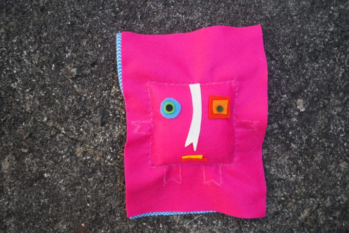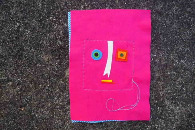 1. Draw a 13 cm X 13 cm square in the centre of the plain felt. This will be your sewing line. Use the scraps of felt to make the eyes, nose and mouth. Position the features and glue or sew into place.