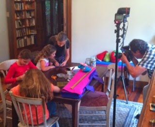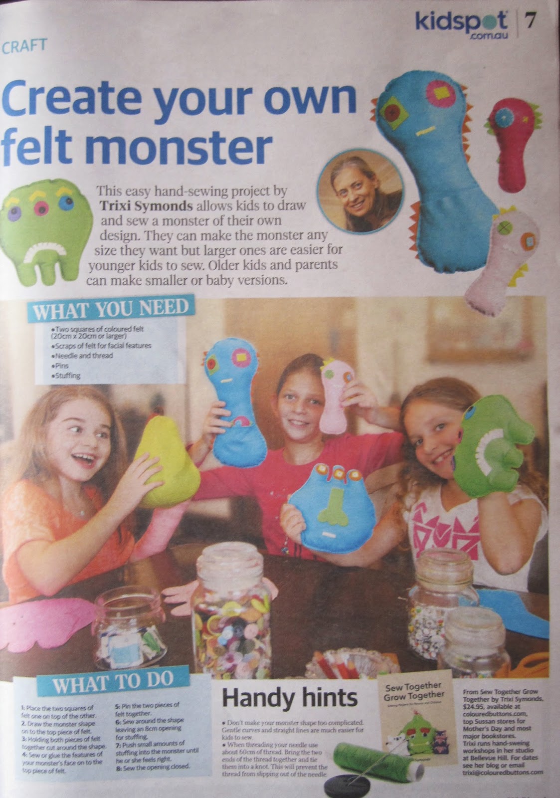 Last week was unusual…and lots of fun. The Saturday Telegraph’s Lift-out section “best weekend” was running a feature on my book that focused on a simple kids’ sewing project for their page. They needed photos of kids sewing the project so I asked 3 of my students to come after school for the shoot…they had felt monsters to sew while the Telegraph’s photographer Bob took photos of them…the girls got so engrossed in their work that they kept forgetting it was a shoot and would respond to Bob’s instructions with “I just need Trixi to check my sewing first”…Bob just smiled and waited: