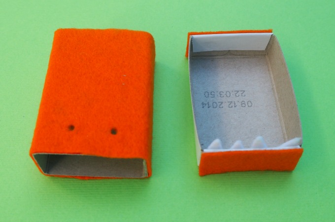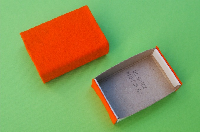 Cut a piece of felt to cover the matchbox. Cut 2 smaller pieces of felt to cover the ends of the matchbox drawer.