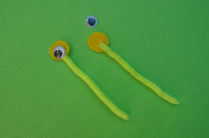 Cut out a circle of coloured felt and glue one of the pipe cleaners onto it. Then glue a goggly eye on top of the pipe cleaner.