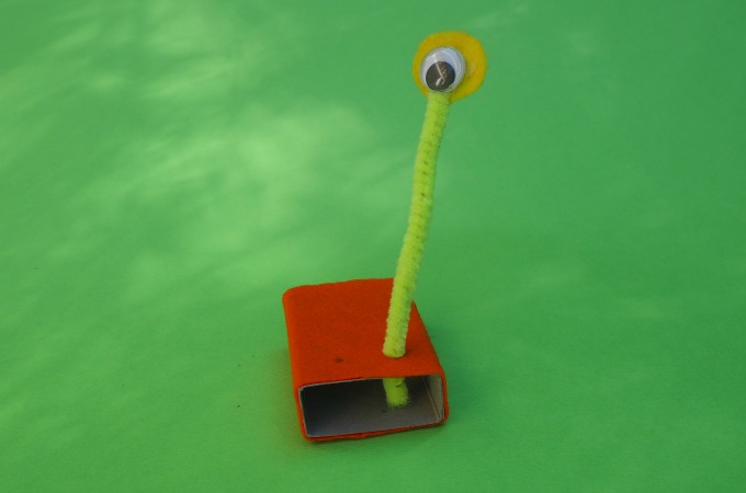 Poke each of the pipe cleaner eye stalks through a hole in the matchbox. Bend back the bit of pipe cleaner that is in the box so it lies flat against the inside surface of the top of the box. Use a piece of sticky tape to hold it in place.