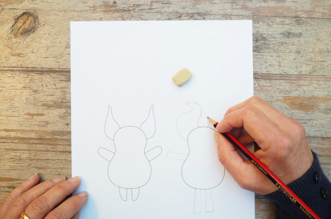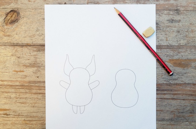Next, take the gourd-shaped limbless template used for the front of the softie and let your kids draw ears, arms and legs onto this in whatever shapes their imaginations come up with. Cut out their drawing and use it as the template for both the back and front of the softie’s body. Remember to chose different colours for the front and back of the body and make the softie just like the softie in the tutorial above. When you finish sewing and stuffing your softie you can create different colour patterns just by cutting off the top layer of felt on the ears, arms and legs.