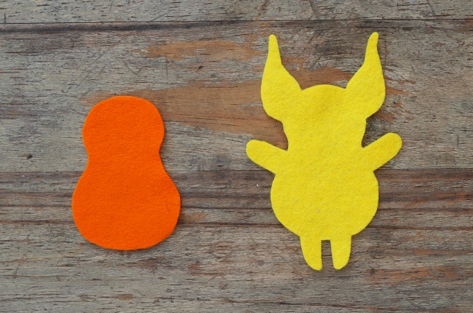 Download and use the templates to cut out the front of your tiny monster softie from the orange felt and the back from the yellow felt.
