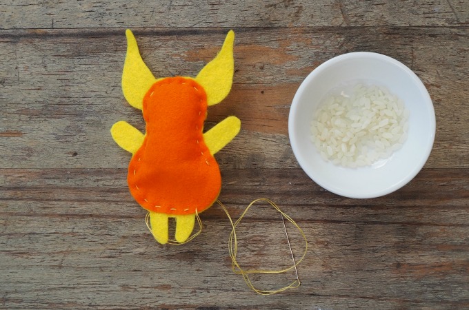 Fill the bottom half of the softie’s body with rice grains. If you prefer, you can use an inorganic granulated weighting material.
