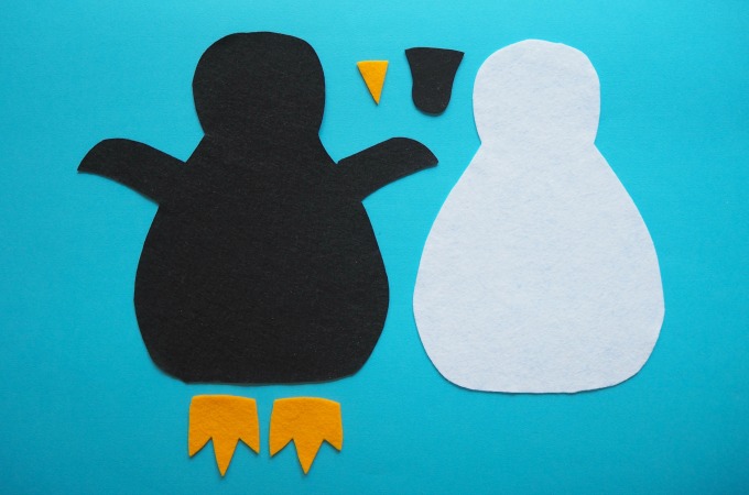 From the white felt, cut out a penguin shape but without wings as shown above.