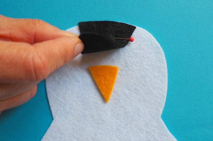 Pin the black head stripe onto the white penguin shape and position the base of the beak just underneath the stripe as shown in the photo above.