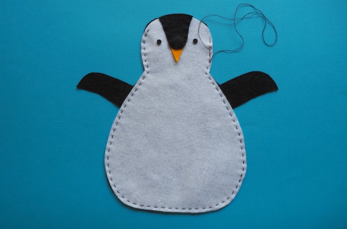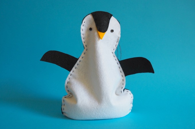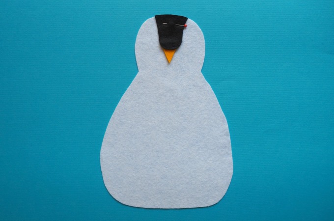 From the black felt, cut out a penguin shape with wings as shown above. Also cut out the black head stripe above Pengi’s beak.