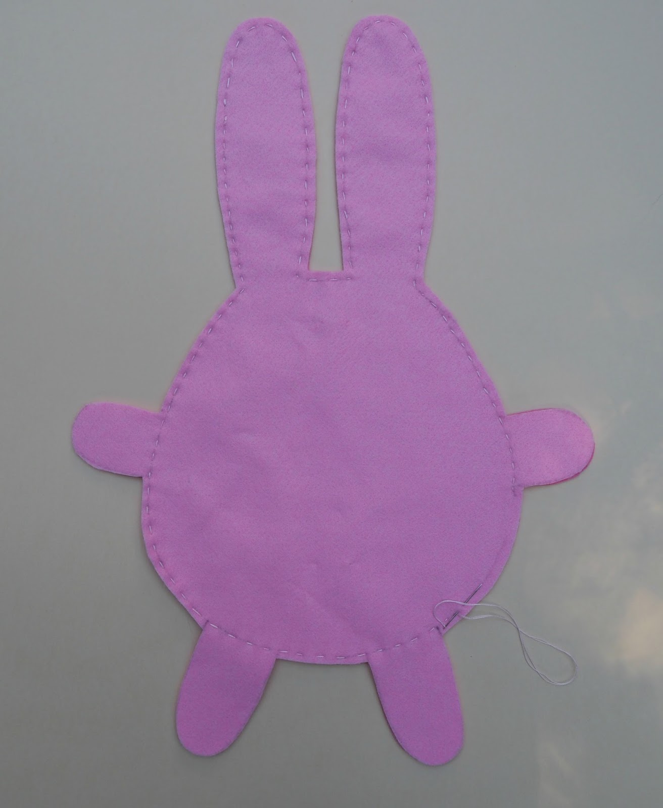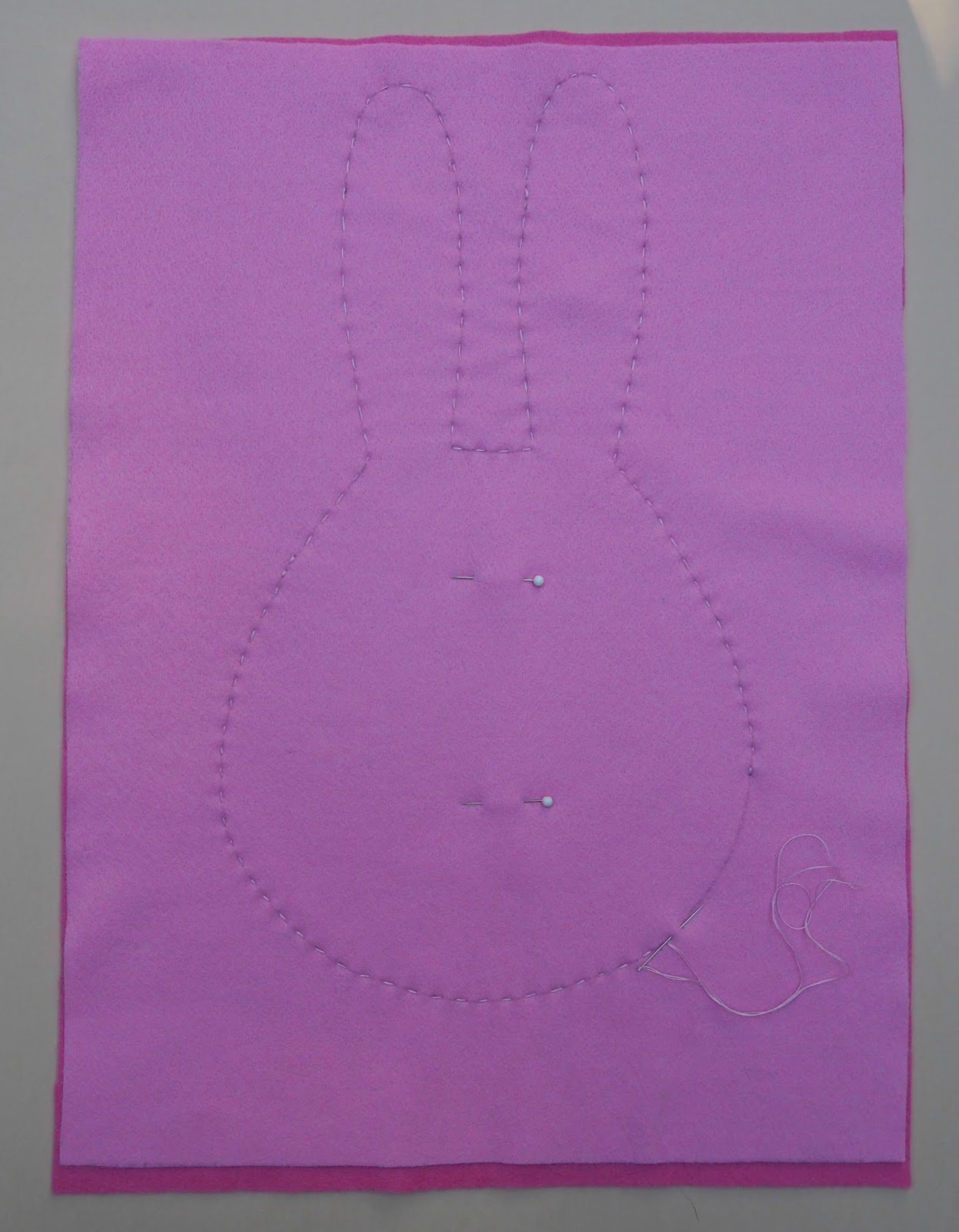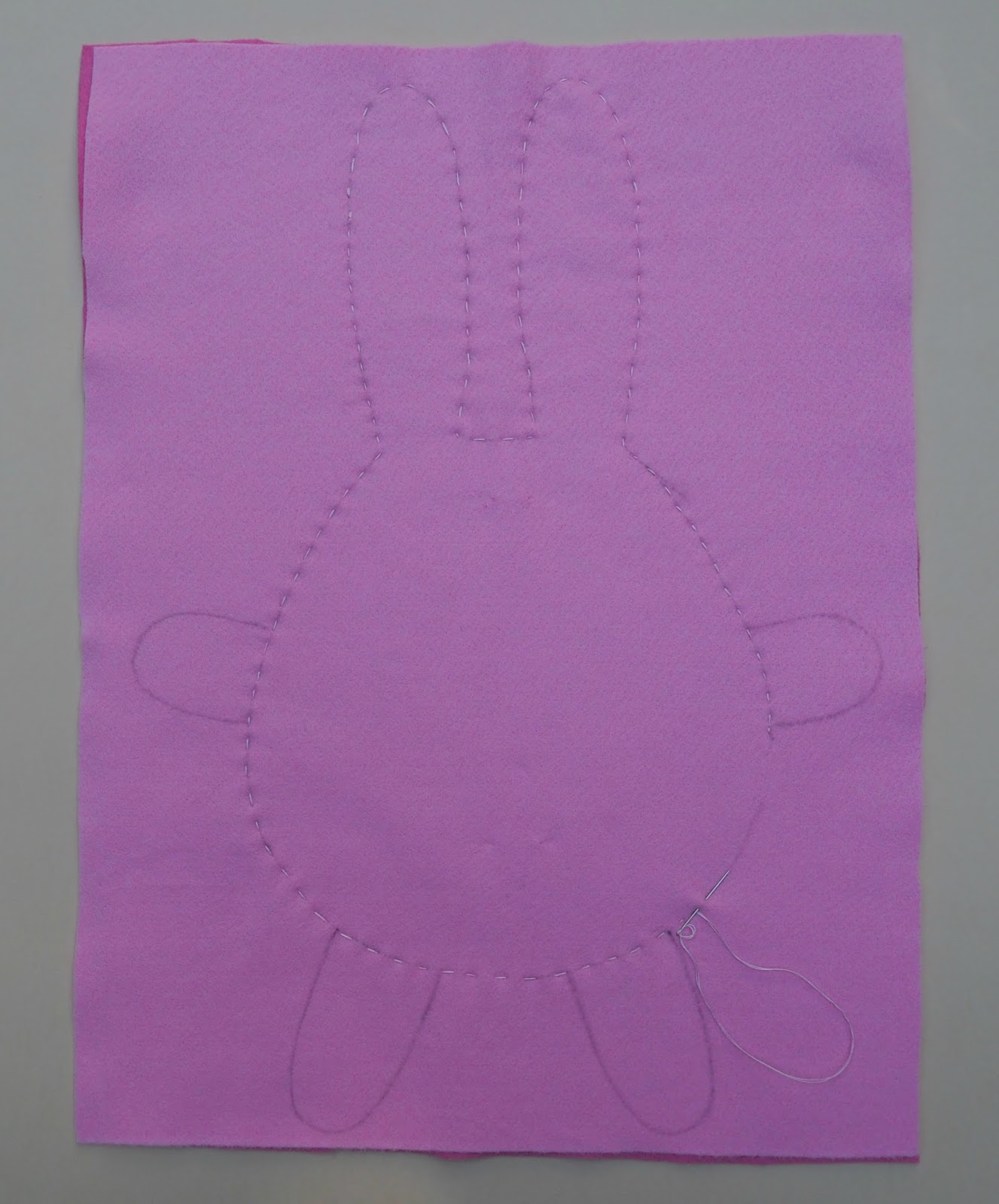 Pin the two pieces of felt together and sew around Bunny’s body. Leave an opening for stuffing. Remove the pins.