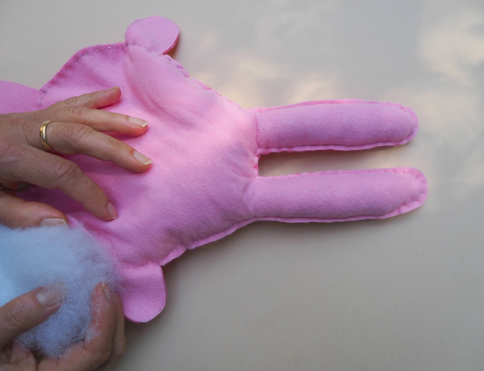 …and when the ears are firmly stuffed, you can take larger tuffs and keep pushing them into Bunny’s body until they are evenly distributed…