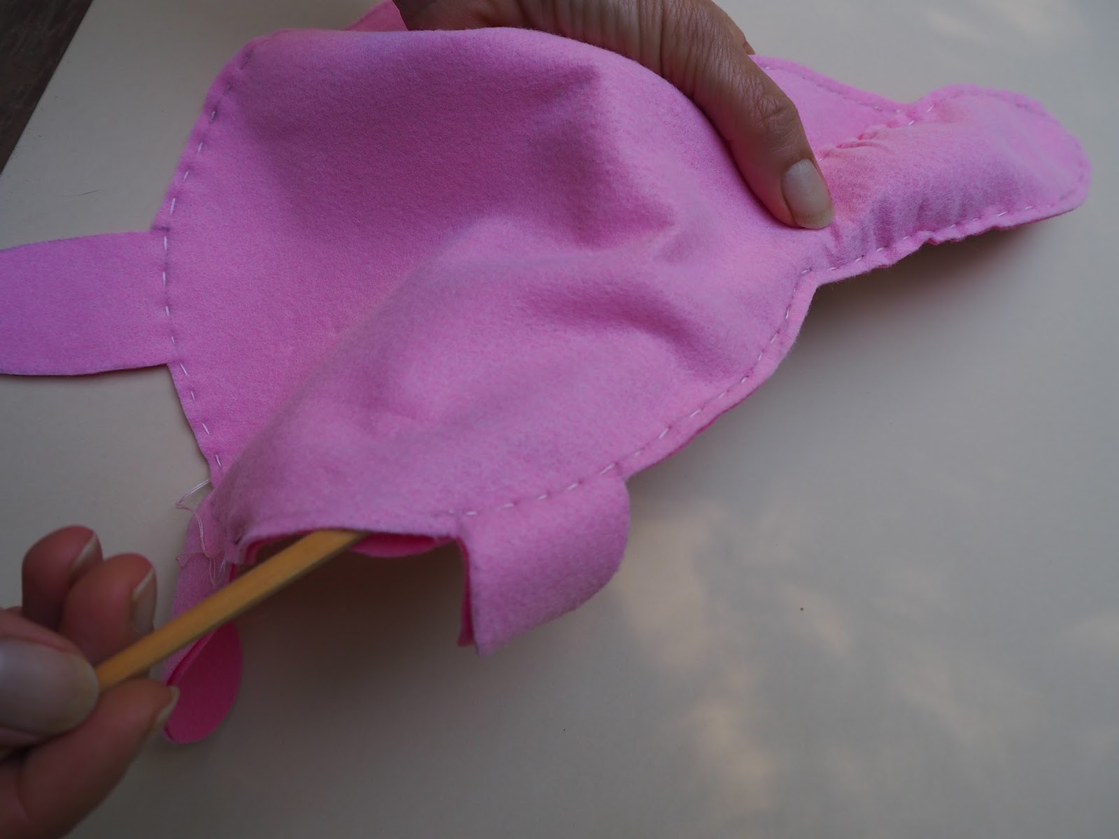 Glue on wiggly eyes. Cut a small nose from the leftover dark pink felt and glue into place. Draw on the tiny mouth.