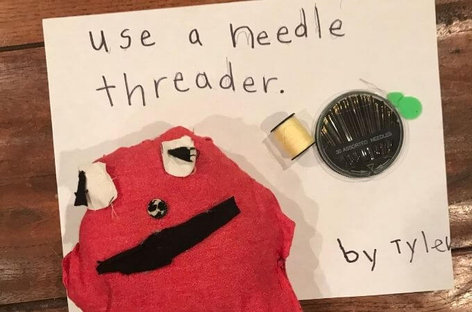I don’t actually use needle threaders in my workshops. Instead I prefer to get the kids to try and thread their own needles or I help them with the threading. However, I don’t think that there’s any reason to avoid using a needle threader and some teachers find them very useful aids…especially if you’re teaching a large group of kids! I know Amie Plumley at Sewing School uses the LoRan threaders in her workshops. Just make sure the hook on the threader you choose can easily go through the eye of the needle you’re using.