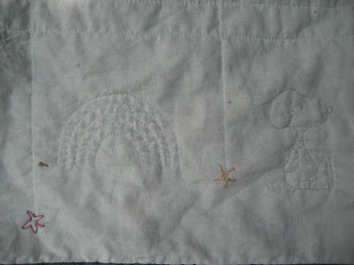 I quilted pictures of her favorite characters and objects – Snoopy, Woodstock, starfish-flowers, rainbows, etc – around the border of the quilt: