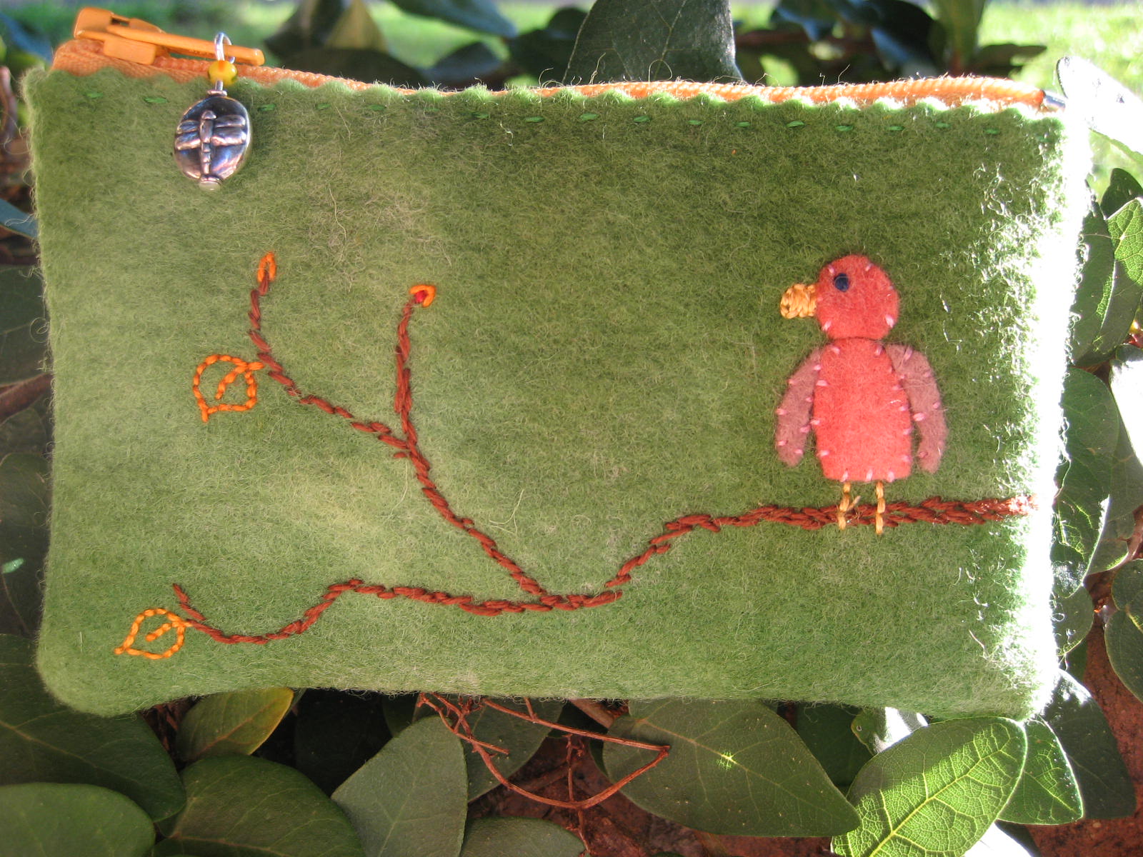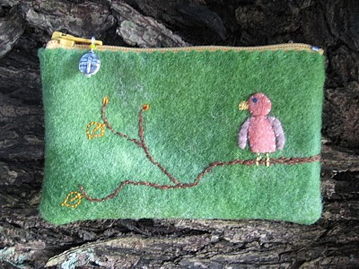 …well, I’m not exactly “westering” but yesterday I got the chance to make another purse…rushed it through at the last minute…this time for Yiscah, my “baby”, who’s off to study design 🙁 at the Bezalel Institute in Jerusalem…just something little for her to keep her camera in…the regular ones are soooo ugly…and she loves green…which is why the lorikeet has become a rosella…another Australian bird but with a lot more pinks in it’s multi-coloured feathers…the leaves are the last ones of autumn (which are still all over our garden even though it’s already mid-winter here)…and the dragonfly zip-tag…well that’s for summer that’s coming: